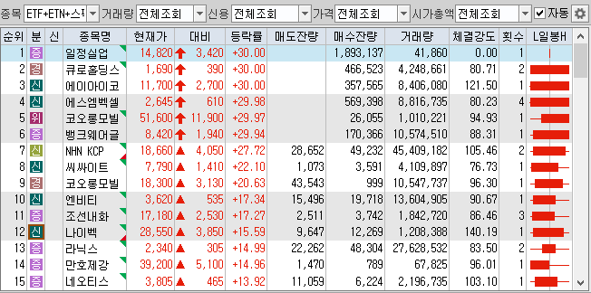 1. 일정실업 (30.00%) : 자동차부품관련주, 시총100억대, 자동차내장재사업, 저시총, 자사주 처분, 1 : 5 비율 액면분할 결정, 개별 등락