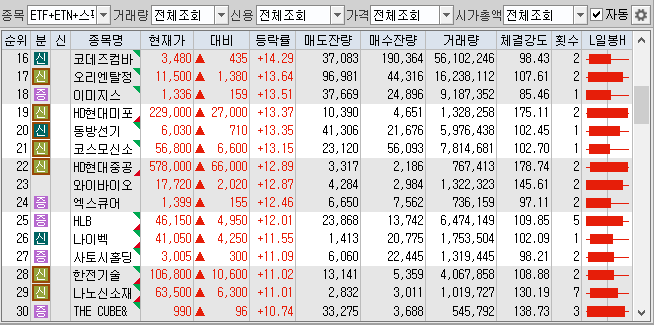 24. HLB (11.17%) : 의료기기관련주, 시총6조원대, 의료기기&헬스케어&지주사업, 자사의 '리보세라닙'과 중국 항서제약 '캄렐리주맙' 병용요법을 사용한 결과 암이 재발하거나 진행되지 않고 생존한 기간이 수술 단독 치료에 비해 2배 이상 연장됐다는 연구 결과 발표 ⇨ 제약바이오관련주 부각