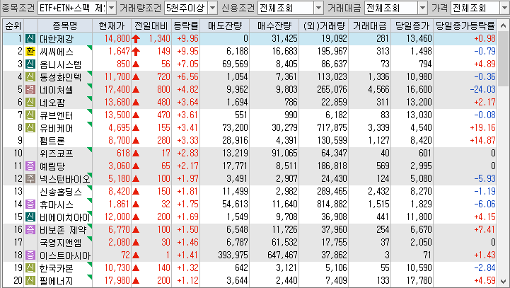 10. 펨트론 (14.87%) : 전자장비관련주, 시총1700억대, 3D검사장비사업, 테슬라의 동사 실사 방문 및 중·장기 파트너십에 대해 논의 소식, HBM 웨이퍼, TSV 공정 등 검사장비 성능 평가 진행 중 ⇨ 반도체 관련주 부각