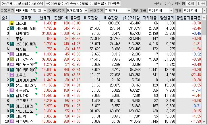 13. 큐렉소 (14.60%) : 제약바이오관련주, 시총3800억대, 의료로봇&기기사업, 최근 클로봇, 티로보틱 스 등 로봇관련주 순환매, 상반기 내 LG전자의 베어로보틱스 인수 완료 예정 소식 ⇨ 의료로봇사업 ⇨ 로 봇관련주 부각