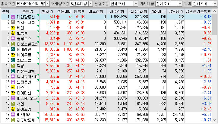 8. 티와이홀딩스 (18.05%) : 미디어관련주, 시총1200억대, 지주사업, 자회사 태영건설 관리종목 지정 해제 소식 등, 개별 등락